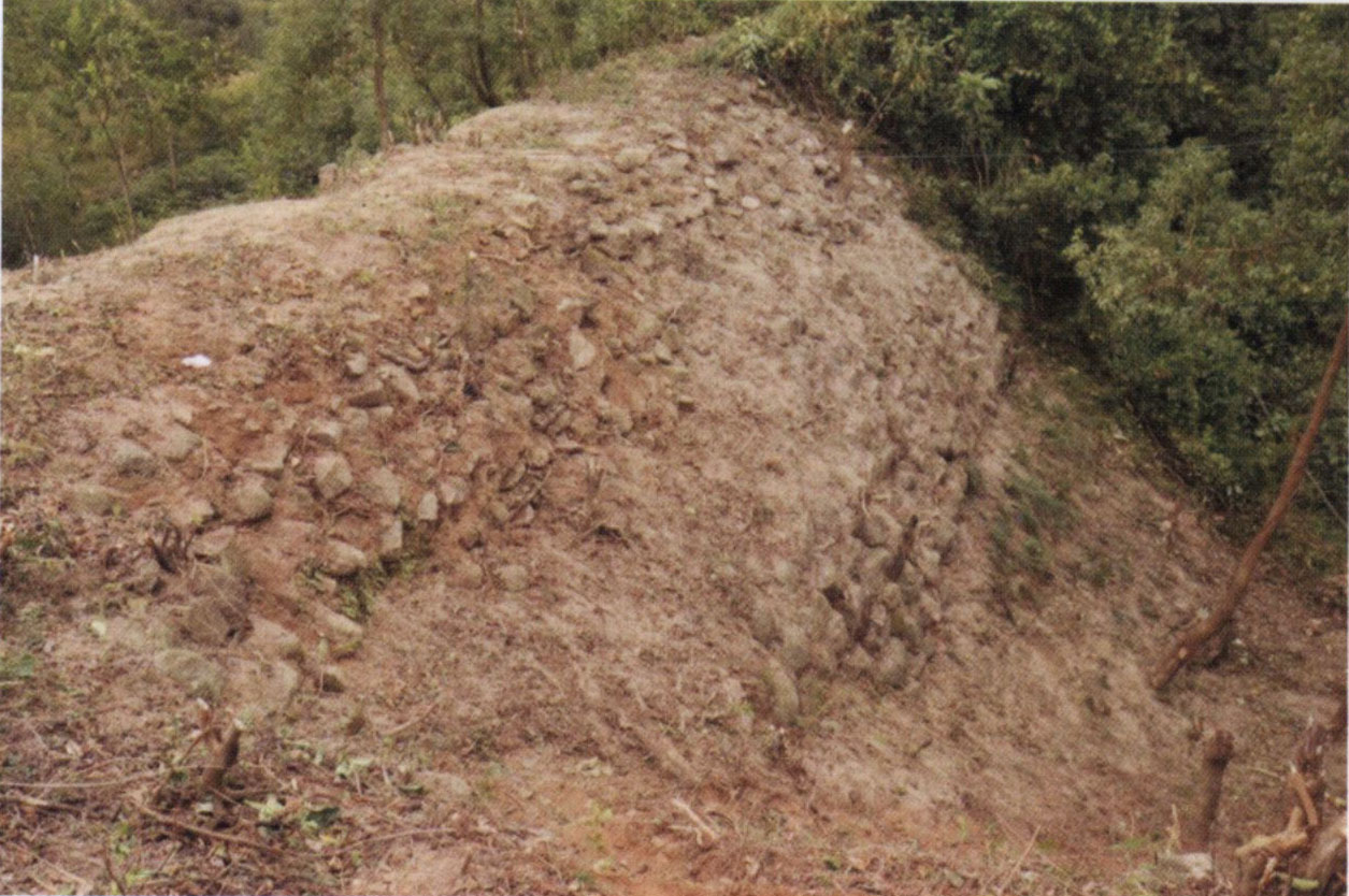 - 图为城墙外侧保存状况。外墙用粗砂土夹石灰夯筑而成,即为俗称的“三合土”,质地极坚实,内含少量砖瓦碎块。